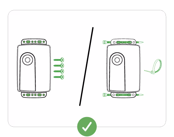La fijación se puede realizar mediante tornillos, abrazaderas metálicas (serflex) o collares de plástico (más bien para una instalación temporal). En la versión protegida, el sensor se puede instalar en una cubierta antivandálica, en una caja nido de madera o en un poste hueco, con un sellado opcional según el contexto.